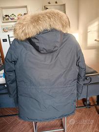 in perfette condizioni, caldo e impermeabile, ideale per climi rigidi, in piuma d'oca e pelliccia removibile, brand concorrente di Woolrich, taglia Small, io vesto Medium ma per questo modello ho dovuto prendere una Small.