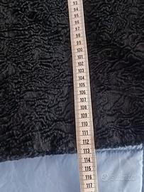 Cappotto nero a trapezio in simil pelliccia effetto astrakan, con spacchi laterali, apertura frontale con colletto in ecopelliccia morbidissima e bottone gioiello a vista e con bottoni automatici nascosti sulla lunghezza; maniche con eco pellicciotto sul polsino, tasche verticali inserite nel fianco. Indossato solo una volta e in perfette condizioni. Taglia XL (ampia vestibilità vedere le foto con le misure).