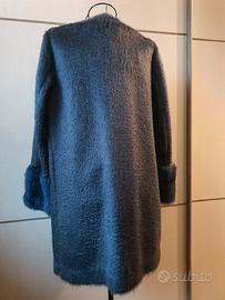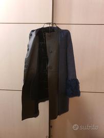 Splendido cappottino Olivieri in lana Merino nello spettacolare color blu carta da zucchero e nappa nera. Polsi alti in ecopelliccia, tasche a filetto laterali ed allacciatura con bottoni a pressione.