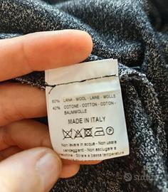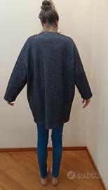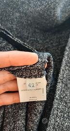 Cappottino oversize grigio scuro con dettagli finiti in nero (vedi i 4 bottoni) di Isabella Clementini. Made in Italy, taglia 42, sopra la metà coscia, con taglio maniche particolare che dona effetto oversize. Ideale per mezze stagioni in quanto 60%lana e 40%cotone, con due tasche e collo tondo. Praticamente mai messo e da diversi anni in un armadio.