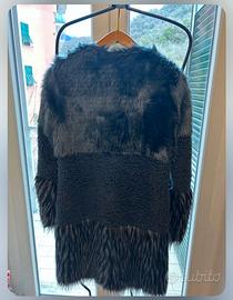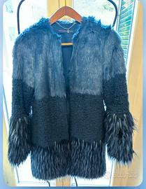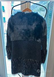 Cappotto in pelliccia sintetica da donna Trussardi Jeans, di colore in diverse tonalità principalmente di blu marino grigio e nero. Presenta una lavorazione in pelliccia con diverse fantasie e lunghezze, che lo rende un capo caldo e distintivo.