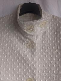Bellissimo cappotto primaverile, perfetto per cerimonie e feste, di Trussardi Jeans, taglia 40, colore panna, stoffa ricamata, due tasche davanti, collo tondo e chiuso a bottoni.