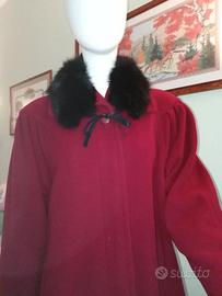 Modello vintage sartoriale di lusso. Modello lievemente svasato con tre bottoni nascosti dalla stoffa. Solo il primo è visibile. Collo in ecopelliccia nera e laccetti da annodare a piacimento. Maniche modello raglan con piccole pieghe sulle spalle che proseguono sulla schiena, creando un delicato effetto arricciato unico e originale. Due tasche laterali oblique. Linea molto originale e molto elegante, vintage, sartoriale. Vestibilità molto morbida. Marca ILIA. Tg 44 IT / 40 EU. Spalle cm 45 Ascelle cm 58 Lunghezza cm 99 Verrà venduto completo di gruccia e custodia con cerniera per armadio. Fresco di tintoria! Perfetto!