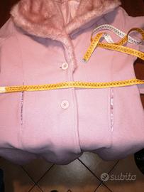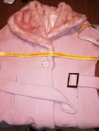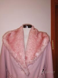 Cappotto rosa da donna con collo e polsini in pelliccia ecologica, con tasche laterali, veste 44/46, un bottone un po' usurato
