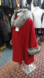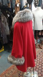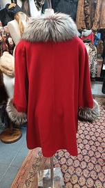 Elegante Cappotto Primaverile, in Lana, Colore Rosso Vivace, Come Nuovo, tg 56, Perfettamente Foderato, Caldo e Comodo, con Ampio Collo e Polsi in Vera e Pregiata Vera Volpe Argentata.