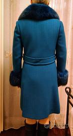 Splendido cappottino colore turchese. In pura lana, con collo e polsi in vera pelliccia di volpe.Produzione sartoriale. Modello a doppio petto con martingala, bottoni in tinta. Misure: Lunghezza cm. 90 - ascella/ ascella 46 - Spalla 42. Veste una tg. 44. Perfetto, senza alcun difetto.