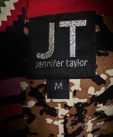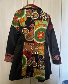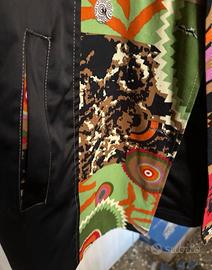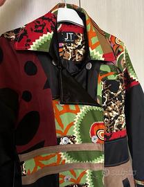 Cappotto/pardessus/soprabito Jennifer Taylor (USA) unico con un design patchwork vibrante e audace. Realizzato con una combinazione di tessuti che creano un effetto visivo accattivante. Veste M magro e anche S pieno. #soprabitojennifertaylorm - Patchwork di tessuti diversi - Motivi geometrici e astratti - Dettagli in raso nero