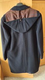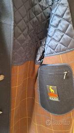 Cappotto Steinbock modello Montgomery in panno Blu scuro e Interno in panno a quadrettoni e parte coprispalla interna trapuntata come da foto. Esternamente ha 2 tasche per le mani ad altezza torace e 2 tasconi sui fianchi. Internamente presenta tasca di sicurezza con cerniera. Taglia 48