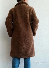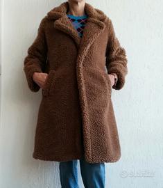 Cappotto da donna Teddy foderato colore marrone biscotto. Chiusura con un bottone e due tasche laterali. Taglia unica, misura spalle 45 cm lunghezza 98 cm, seno 57 cm. Brand Susymix