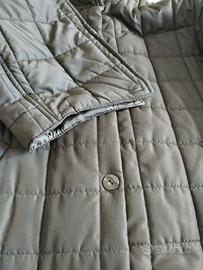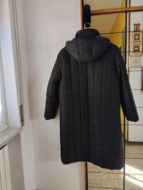 Caldo cappotto trapuntato donna, color nero , con cappuccio staccabile e due tasche. Made in Italy, 100% poliestere. Larghezza spalle cm 43, sottoascelle cm 47, lunghezza cm 82.