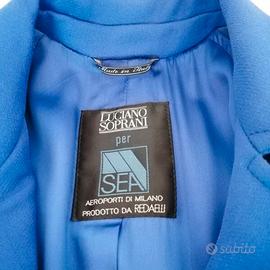 Favoloso cappotto blu elettrico vintage firmato da Luciano Soprani, prodotto da Redaelli come parte della uniforme da hostess. Un vero gioiello che rimanda a quando il viaggio in aereo era considerato un'esperienza lussuosa e riservata a pochi.