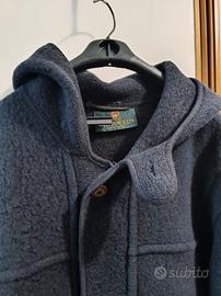 Cappotto da uomo con cappuccio prodotto in Austria da Giesswein, marchio tradizionale famoso per l'altissima qualità dei suoi tessuti. ‼️Taglia 50 (L). Modello intramontabile con 2 tasconi anteriori, doppia chiusura a bottoni (marchiati) e cerniera. In pregiata e calda pura lana vergine di color blu. ‼️Da segnalare la mancanza del bottone al collo. L'etichetta interna riporta la taglia 50 ma credo che possa essere indossato anche da chi porta la taglia 52, eventualmente controllare le misure in centimetri. Offerta perché fuori stagione! Lunghezza manica: 62 cm. Lunghezza intera da dietro: 98 cm. Larghezza spalle: 56/57 cm.