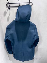 Cappotto uomo blu navy in lana o misto lana, modello con cappuccio, chiusura a bottoni doppiopetto e bordi a contrasto. Vestibilità regular, due tasche laterali, taglia 48/50/54 disponibili Eu "M" "L" "XL"