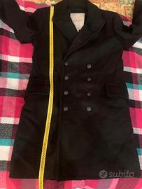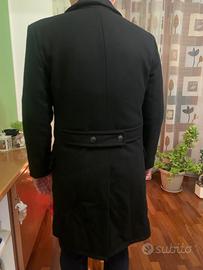 Bellissimo ed elegante cappotto da uomo colore nero, modello doppio petto con bottoni in metallo con figura di ancora a rilievo, collo reverse, tasche frontali con patta, spacco centrale sul retro. Completamente foderato nero, piccole tasche interne. Composizione 70% lana e 30 % nylon. Indossato x un paio di occasioni, pulito in tintoria.