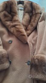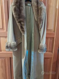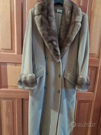 Modello vintage di Valentino Boutique Doppiopetto lungo ,color tortora,caratterizzato da un ampio colletto in pelliccia di visone e polsino coordinati. Cappotto elegante e retrò,tessuto morbido in lana . Taglia /44
