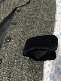 Delizioso cappotto in trama di lana, verde militare melange con bordi in velluto nero, taglia S