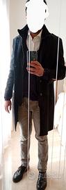 Vendo bellissimo cappotto uomo Versace originale, stile elegante e senza tempo, taglia 48. Cappotto classico con interno in maglia con zip, colore nero, tessuto esterno 100% cotone, chiusura con bottoni frontali.