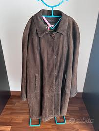 Cappotto vintage donna marrone scamosciato all’esterno e con fodera interna, bottone di ricambio. Vera pelle made in italy. Taglia 44.