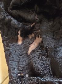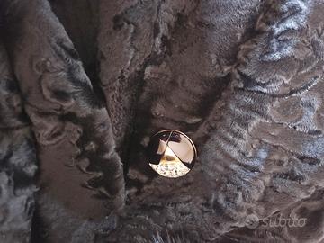 Cappotto vintage nero in astrakan con collo in pelliccia di visone. Ha ottima vestibilità, può coprire molte taglie, dalla 44 alla 52/54. Mostra qualche segno di usura, come mostrano le foto.