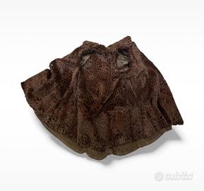 Elegante cappotto in pelle scamosciata marrone con interno e cappuccio in pelliccia leopardata.