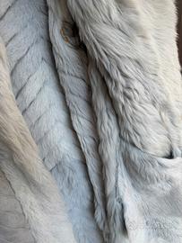 Cappotto originale anni ’70/’80 in montone scamosciato chiaro, con ampio collo, profili frontali e polsi rifiniti in pelliccia naturale (volpe chiara).