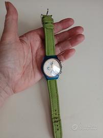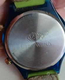 Orologio Capri Watch vintage, con cinturino in pelle verde (stressato dal tempo) e cassa blu.