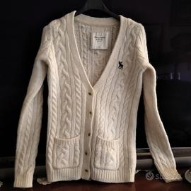 Cardigan unisex Abercrombie &Ficht colore bianco panna, lavorato a trecce, come da foto, due tasche sul davanti. Taglia S