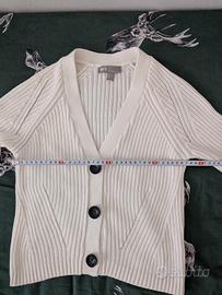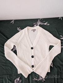 Cardigan sfiancato bianco con bottoni neri, leggermente crop con maniche che all'altezza del polso finiscono svasate per un effetto molto femminile. Non ha materiali sintetici, è completamente in cotone. Morbido e stretch. Adatto per la mezza stagione e per l'inverno se lo si indossa con una maglietta sotto. Le misure sono nelle foto, è una taglia XS ma può andare bene anche ad una taglia S, che di solito io porto. Condizioni perfette.