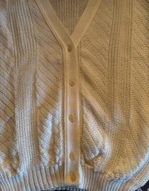 Cardigan bianco vintage da donna in 50% cotone e 50% acrilico con bottoni dai riflessi perlati.