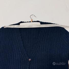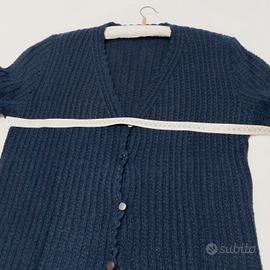 Cardigan blu donna in lana grossa lavorato a coste a mano, molto caldo, aperto davanti con bottoni, scollo a V, maniche lunghe. indossato poco, non ha difetti, pulito. vedi misure esatte in foto.