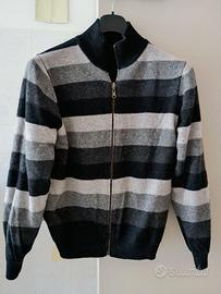 Cardigan con zip Henry Cotton's double face, antracite oppure a righe in quattro tonalità di grigio. 80 lana 20 poliammide, tg M, larghezza spalle 49, larghezza ascelle 58, lunghezza spalla bordo manica 63, lunghezza spalla fondo 62. Ottime condizioni