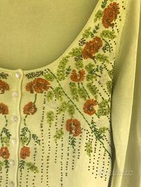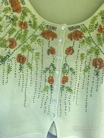 Originale cardigan corto leggero impreziosito sul davanti da motivi floreali con applicazione di perline colorate verdi,arancioni e altri colori applicate a mano visibile sul retro (v foto) .Chiusura con 7 bottoncini e maniche 3/4.