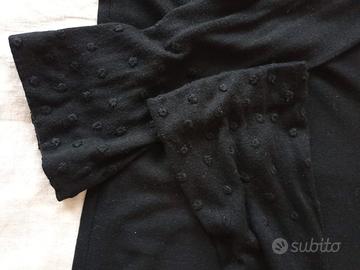 Cardigan corto nero di seta e bamboo con maniche decorate a palloncini in rilievo e bottoni ricoperti di tessuto. Capo elegante. T. 44