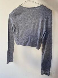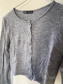 Cardigan corto Zara in morbido tessuto grigio melange, taglia S. Modello a maniche lunghe con scollo rotondo e chiusura frontale con bottoni tono su tono. Normali segni di usura. Vestibilità aderente. NO etichetta composizione.