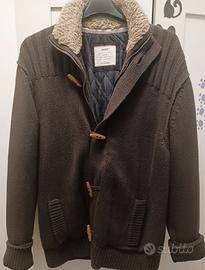 Cardigan pesante o "giacca-maglia" con un design in stile montgomery.misto di 60% cotone e 40% acrilico. L'interno presenta una fodera trapuntata di colore blu scuro, che permette un buon isolamento termico, anche con pioggia. Il collo è arricchito da un rivestimento in finta pelliccia di colore beige, pensato per proteggere dal freddo e offrire comfort. è dotato di una doppia chiusura compresa zip metallica interna per una maggiore tenuta termica.