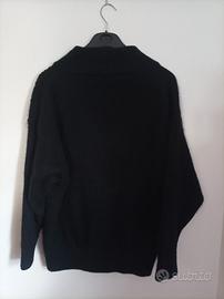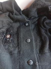 Cardigan donna (Cod A2), vintage, bellissimo ed elegante. Colore nero, con decorazioni e strass sul davanti. 3 bottoni gioiello. 50% lana, 50% angora. Cannole' sui polsi, collo e fondo. Diversi pelucchi di utilizzo, tipici del tessuto. Senza targhetta tg, credo XL, misure: spalle 66, ascelle 62, lunghezza 67, manica 59. Ottime condizioni. Non spedisco INPOST