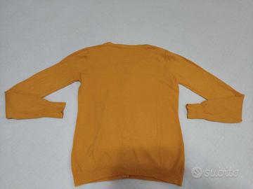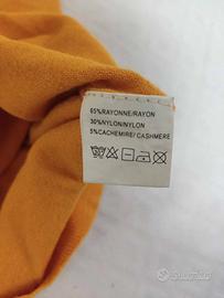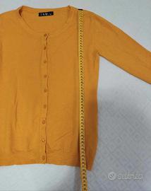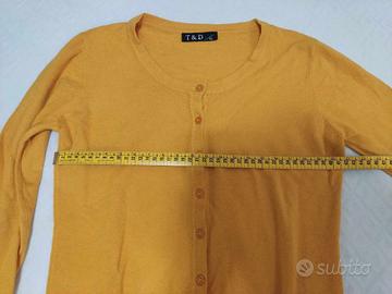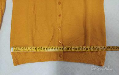 Cardigan donna in maglia con 5% Cashmere giallo, scollo rotondo. Taglia: tra una M/L Composizione: 65% rayon, 30% nylon, 5% cashmere