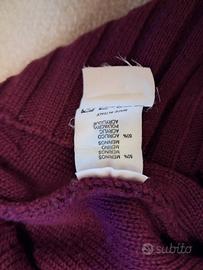 bellissimo cardigan donna con chiusura con bottoni, colore viola melanzana, con polsini e bordo a costine, motivo a treccia e righe ondulate sul davanti. taglia 46, in lana merino e acrilico. ottime condizioni (presenza di qualche pelucco della lana).