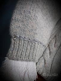 Elegante e morbido cardigan in maglia di lana melage avorio e verde acqua, grandi treccioni sul davanti e perfilo uncinetto in argento lurex. Bottoni decorati ad intarsio. Tg 44/48. Abbinamento coordinato con elegantissima camicia in rigatino di cotone con abbottonatura e polsini ricoperti da pizzo a petali.