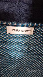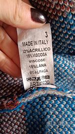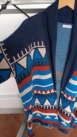 Cardigan aperto multicolore, motivi etnici, bella colorazione sui toni del blu e del marrone. Molto bello e caldo, composizione nella foto. Contiene lana e alpaca. Presenta un lieve pilling che con la buona volontà si può togliere. Può essere interpretato aperto o chiuso con una cintura. Veste dalla 40 alla 44 abbondante.