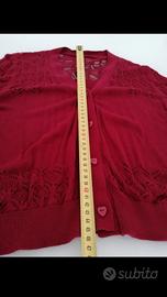 Giacca coprispalle, colore bordeaux / rosso scuro, tessuto traforato, ricamato, bottoni a forma di cuore.