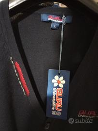 Bellissimo cardigan con bottoni Guru, NUOVO per uomo,con cartellino e cellophane taglia L, tessuto misto cotone. Colore blu scuro. Particolari profili gialli sottili in tutto il perimetro delle cuciture. Condizioni perfette.