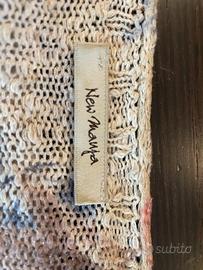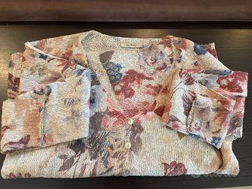 Cardigan in maglia con bottoni e stampa a fiori, mezze maniche (marca New Manja), colore beige, cottone; misura media
