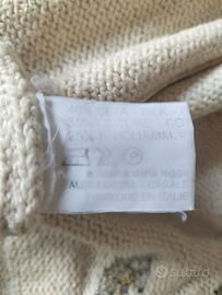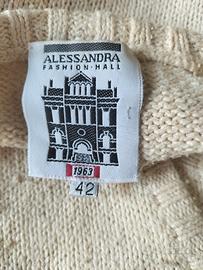 Cardigan donna in seta e cotone di Alessandra Fashion Hall, made in Italy, taglia italiana 42, di colore panna. Usato ma ben tenuto, vestibilità ampia. Seta 40% - cotone 35% - Poliammide 25%.