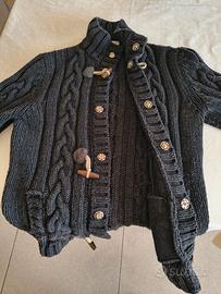 Cardigan lana filo grosso idrorepellente con alamari in pelle e corno, chiusura doppia con bottone a pressione, da utilizzare come giacca informale genere sportivo. lunghezza manica e giacca (retro dal collo) 70 cm. Larghezza spalle 42 cm, flessibile perché manufatto in lana. Marca kaos