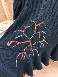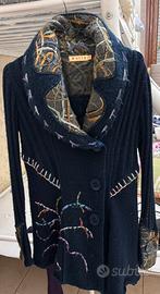 Splendido cardigan lungo/giacca in maglia blu scuro, marchio Kaily, caratterizzato da ricami colorati fatti a mano e colletto decorato in stile artistico/bohémien.
