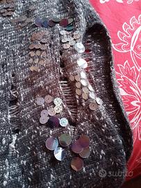 cardigan lungo grigio scuro e bianco impreziosito da paillettes , due spacchi laterali