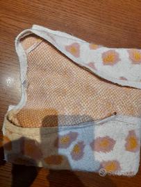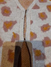 Il maglioncino a tema animalier è usato ma in ottime condizioni, in vendita per mancato utilizzo. Il capo è di marca Idexe. Il cardigan è di color bianco panna, decorato con un motivo leopardato rosa antico e dettagli in filato dorato glitterato (lurex) che lo rendono luminoso al tatto e alla vista. Presenta un elegante scollo a V e una pratica chiusura centrale con un gancetto metallico discreto. I bordi delle maniche e la base sono rifiniti a costine per una migliore vestibilità. Può essere usato come capo casual sopra una t-shirt o per occasioni più ricercate grazie al suo tocco brillante. Il capo è realizzato in 64 % acrilico, 34 % poliestere e 2% elastene: un materiale morbido e soffice, e può essere lavato in lavatrice a 30°C (ciclo delicati) a rovescio. Esso ha le seguenti dimensioni: altezza 51 cm, lunghezza manica 48 cm e larghezza manica 13 cm. La taglia indicata è per ragazza di 13/14 anni (altezza 164 cm). Il costo è di 4 €. Possibilità di acquisto con oggetti per il tempo libero / garage, per la casa e lampadari. Ritiro in zona Scorzè oppure a Ferrara oppure spedito con costi di spedizione a carico del compratore. Per informazioni dettagliate scrivere al numero 3400947484