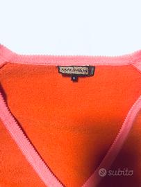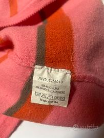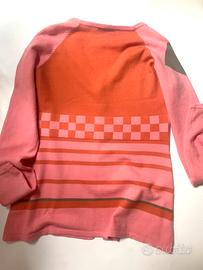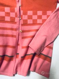 Cardigan in lana, per donna, bicolore rosa intenso e arancione con motivi geometrici