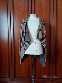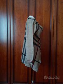 Bellissimo cardigan con pattern check ispirato al classico Burberry, in tonalità beige tortora con accenti bordeaux rossi. Modello avvolgente con collo alto a cascata, maniche lunghe e vestibilità oversize rilassata - perfetto per autunno/inverno!